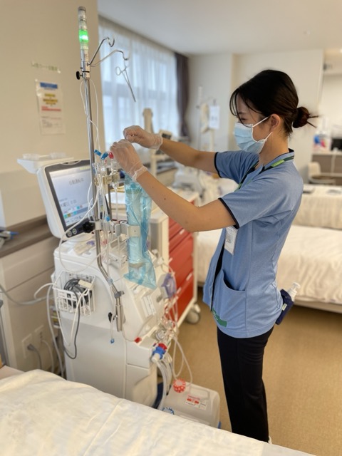 透析ベッド数は8床あり、入院透析を主として急性期・慢性期の腎不全の患者さんへの血液透析HD、オンライン血液透析濾過、アフェレシス療法、その他の血液浄化に対応しております。また同じ法人内でのリハビリテーション病院、クリニックでの血液浄化療法にも携わり、準備、穿刺から透析実施、洗浄、部材の管理、装置の点検など保守管理に努め、安全な血液浄化療法を提供できるように取り組んでおります。