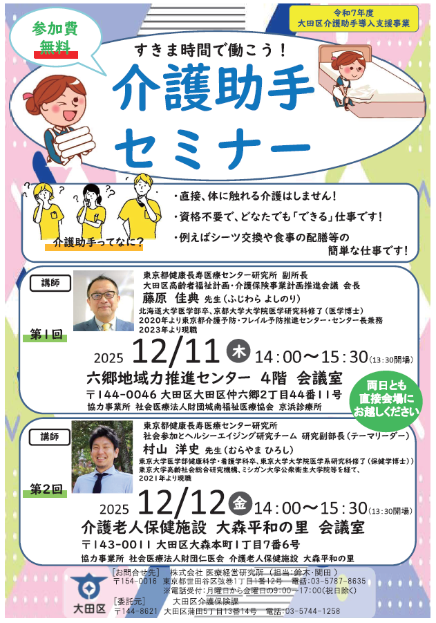 大森平和の里は令和7年度大田区介護助手導入支援事業の指定を受けまして、介護助手導入を進めています。大田区とも協議を進めておりまして、12月12日(金曜日)の14:00~15:30に介護助手セミナーを開催することになりました。