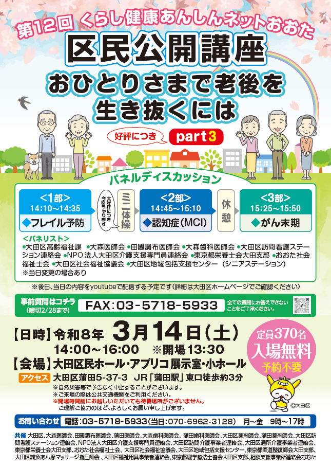 第12回くらし健康あんしんネットおおたが開催する区民公開講座「おひとりさまで老後を生き抜くには part3」に登壇することになりました。